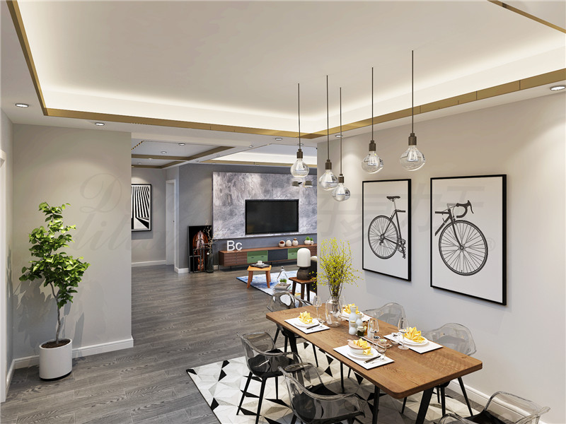 线条干净利落是北欧的主要特征,布艺沙发、灰色地毯和木质餐椅设计,极富质感。