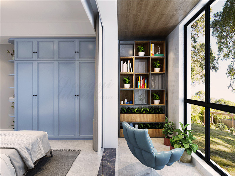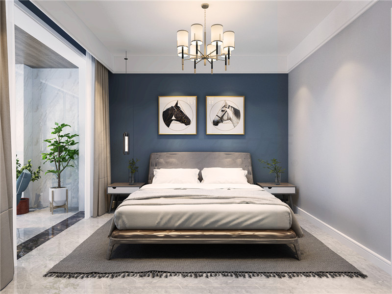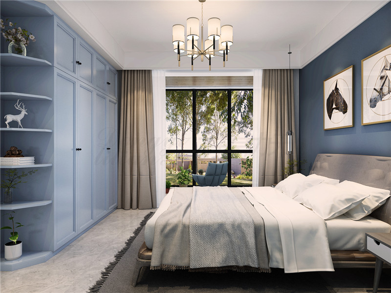 卧室:以沉静的灰蓝色素色墙面为核心,郑州家装公司利用大对比的撞色产生绝佳的视觉效果。