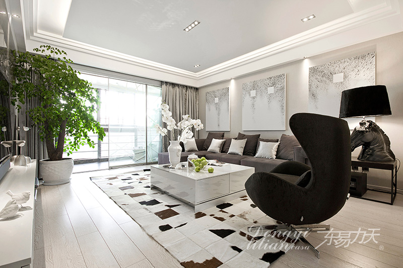 深色的沙发,白色的茶几,白色乳胶漆墙面,白色的花纹木质地板,宽敞明亮的阳台,简单而又不失现代元素的感觉。郑州装修公司|120㎡现代简约,经典黑与白...