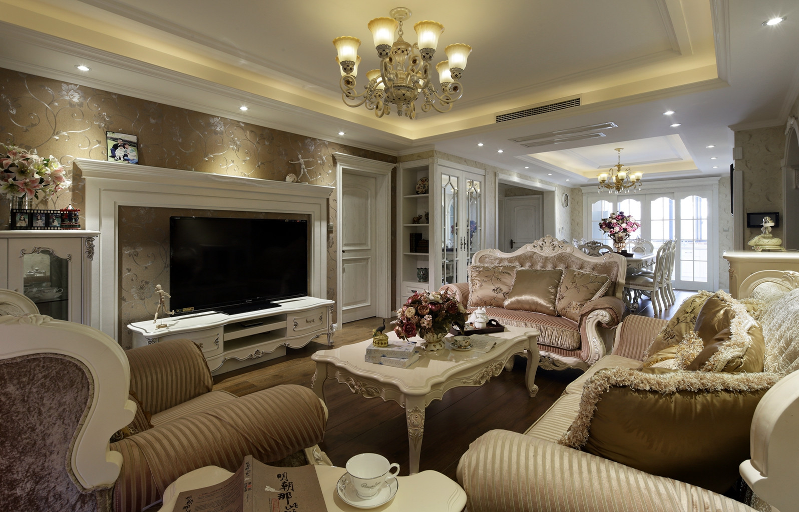 郑州装修公司设计案例,148平古典美式风格,客厅以深咖啡色为基调,咖啡色的壁纸、银色的花纹、经典的美式家具,都透着美式的温馨,电视墙壁炉设计对称造型,立体感十足,以白...
