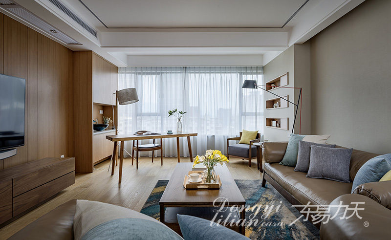 客厅以米黄色及木色家具为主,棕色皮质沙发配以灰色及浅蓝色抱枕,简单而又实用,靠窗位置放上一个长条纯木桌子,冲上一杯咖啡,打开一本书,享受恬静的休闲时光。郑州装修公...
