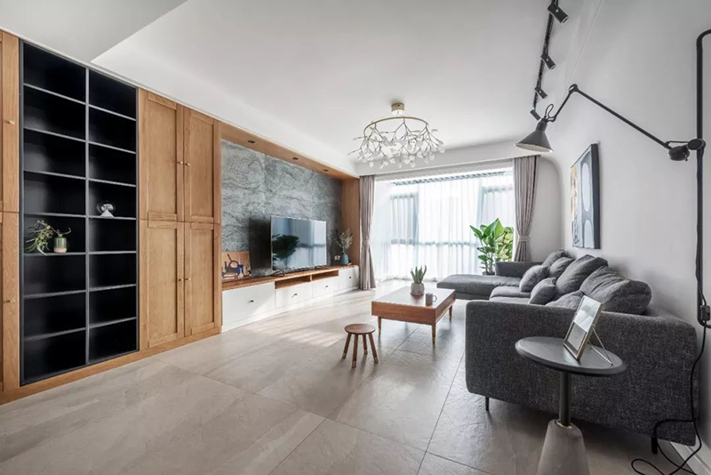 客厅电视墙以木质定制柜体+灰色大理石墙面背景,整体简洁年轻的设计,显得自然优雅好大方。郑州装修公司|145㎡现代简约风,家本就该舒适自然!!!...