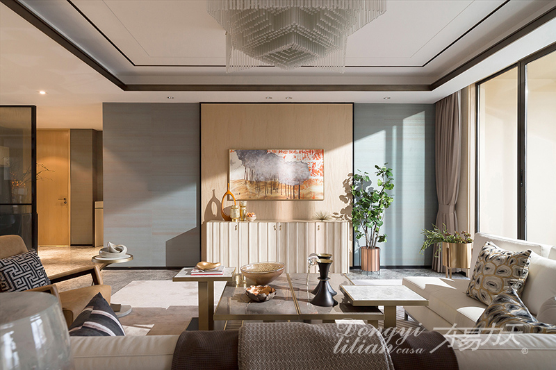 客厅空间采用成熟稳健的淡蓝色和沉稳低调的暗金色为基调,用时尚简约的风格让空间户型发生巧妙变化,带来别致舒心的韵律感。郑州家装公司|188㎡时尚简约风,这才是您想要的家...