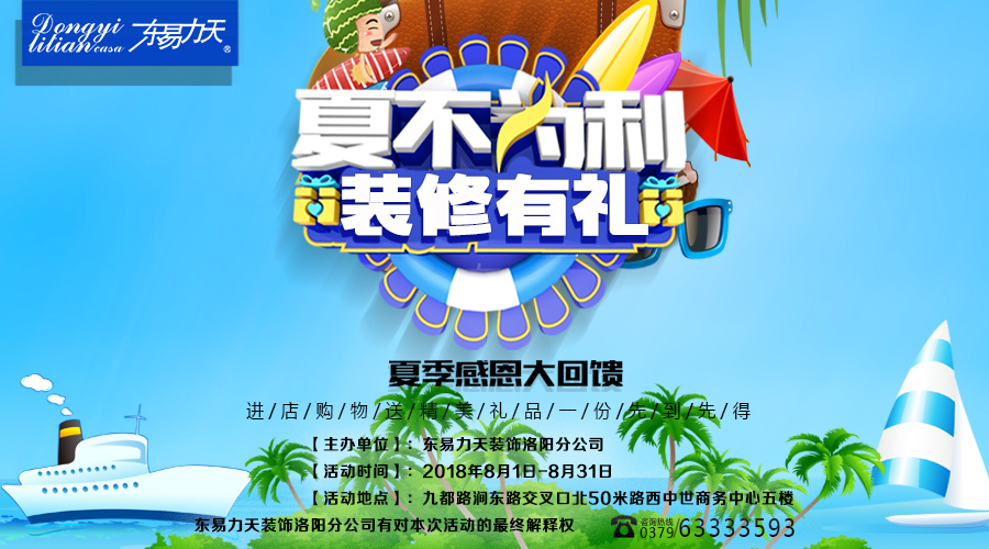 原标题:夏不为利,装修有礼东易力天装饰洛阳分公司钜惠! 【主办单位】:东易力天装饰洛阳分公司 【活动时间】:2018年8月1日-8月31日 【活动地点】:九都路涧东路交叉口北50米路...
