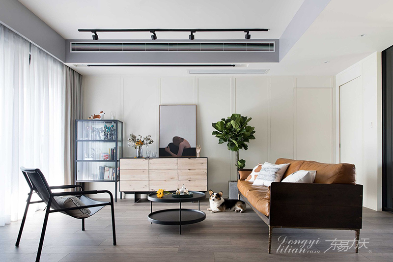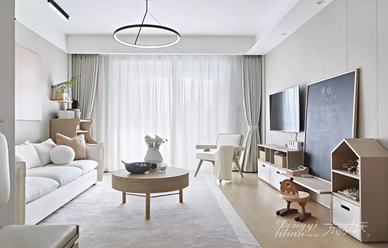 客厅以素雅的白色为底,夹杂着浅淡而温润的木色,梳理出了柔和而婉约的空间气质。这是一个打动人心的空间,宜居式开启的生活旅程。郑州家装公司|89㎡舒适简约风,宜居式生活空...