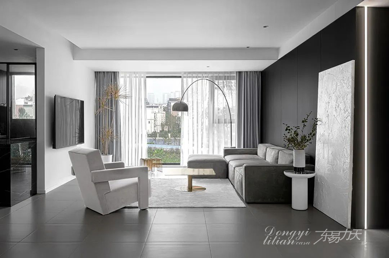 整屋以黑白为主色调,全屋铺贴了浅灰哑光的地砖,设计师将阳台释放并入室内,改善客厅采光的同时增加了视觉的可触及面积。郑州家装公司|135㎡黑白灰,你无法拒绝的高级质感的家...