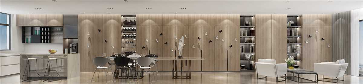郑州别墅装修设计师摒弃了那种垂直感太强的吊灯,而是采用了内嵌式射灯,否则不然会占据你头顶上的一大片空间。同时为了减少层高低带来的压抑感,设计师在选购家具时尽量选择了架构简单,低矮的家具,可让我们的视觉更加开阔,更加舒适,避免了拥挤与不适感。餐厅、起居室均采用实木板材推拉嵌入式壁柜,有效增加收纳储物空间,且使整个空间更加完整。