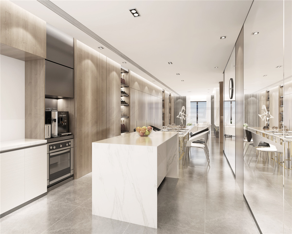 鉴于层高不足,客餐厅、厨房、起居室整体采用不吊顶设计,在选择灯时,东易力天