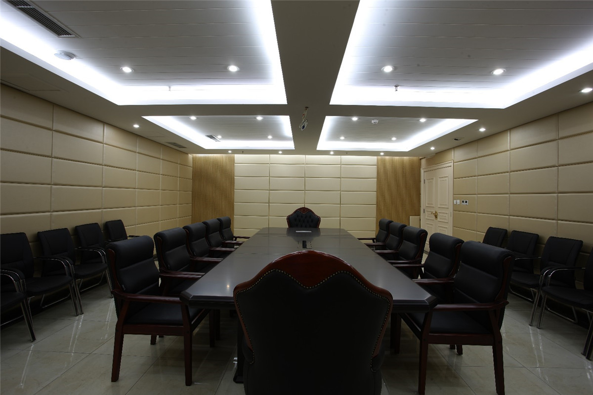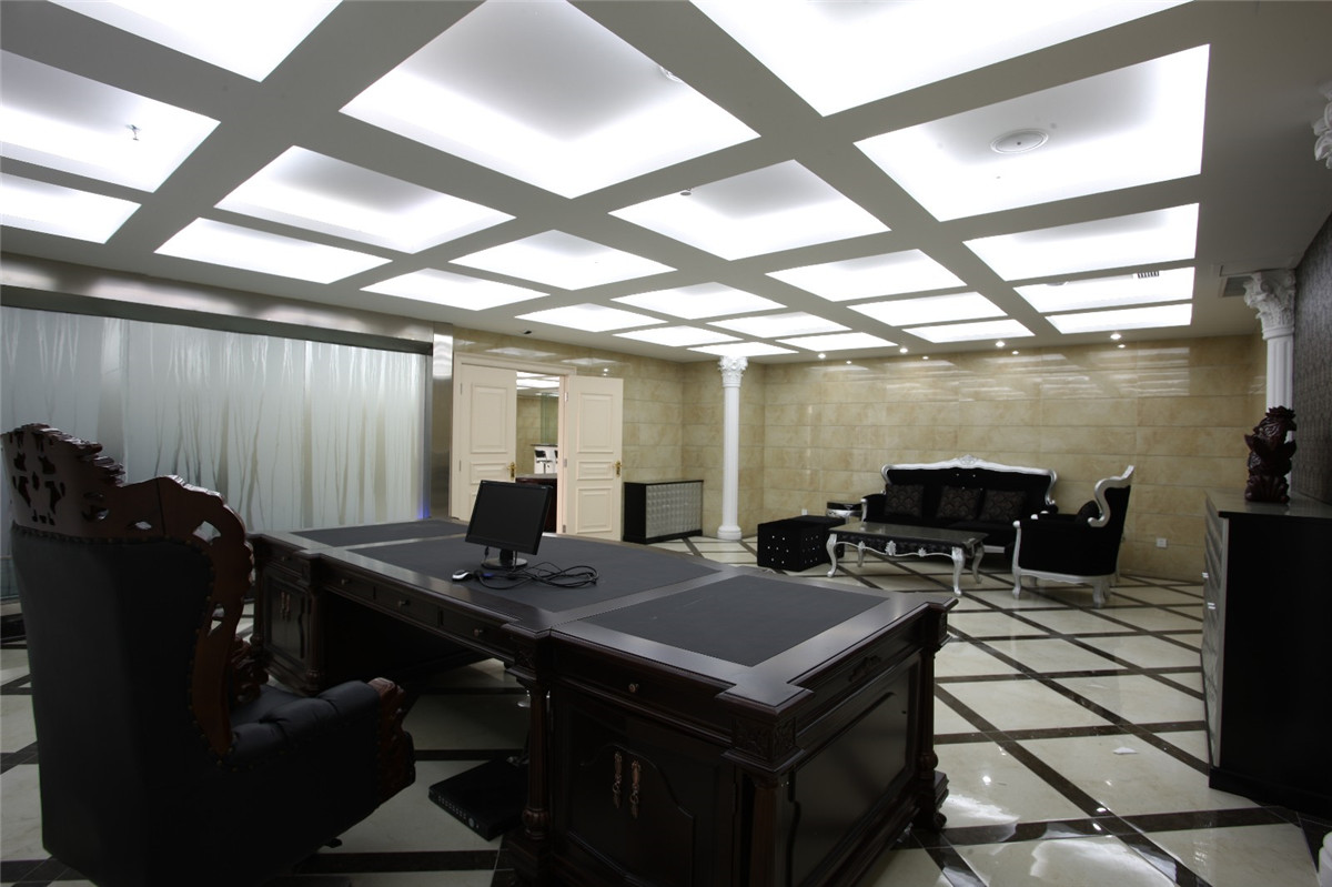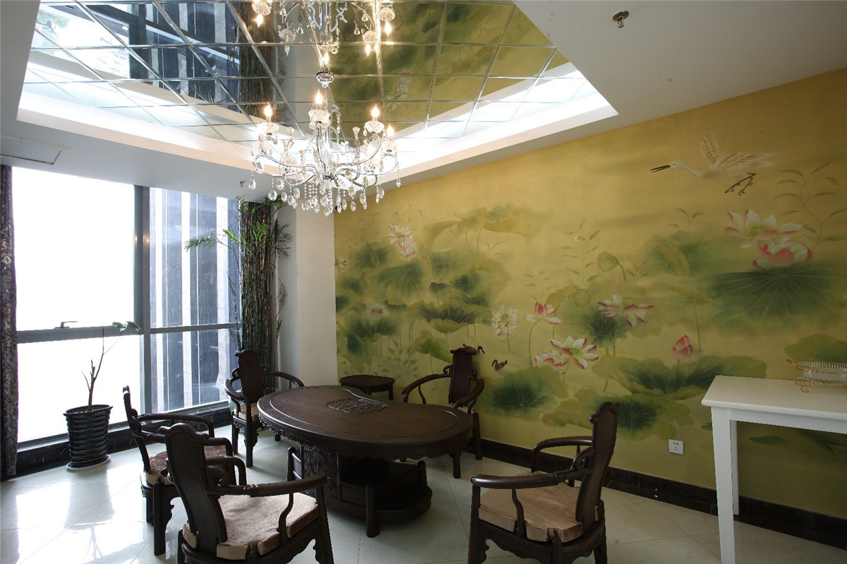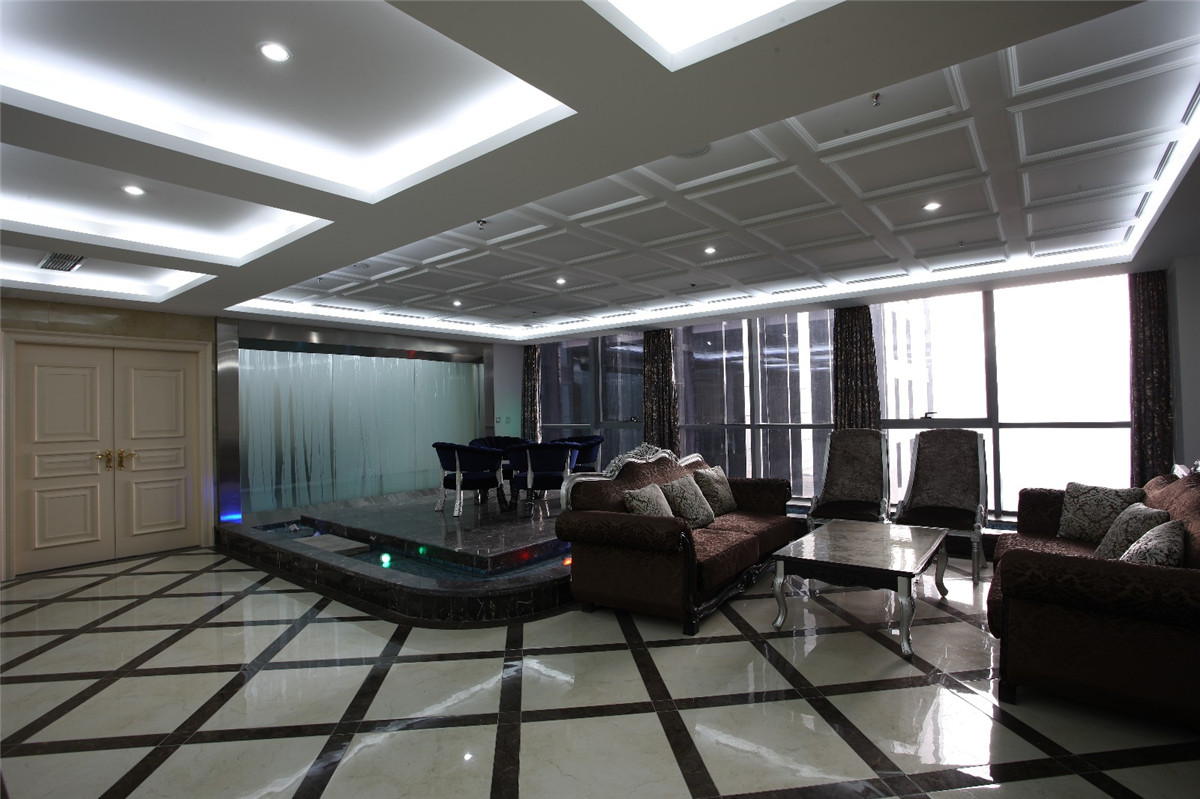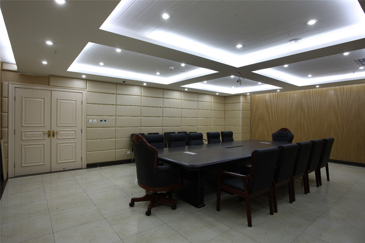采用混搭风格,欧式和新中式糅合在一起,既能彰显高贵气质,又不失大气稳重,这象征着企业根基稳固。整体没有过多的花哨装饰物,装饰色系较冷,不会出现较大的色差,对于商务谈判具有一定的信任价值。搭配中国风的山水字画,茶道,对促进谈判合作有一定帮助。